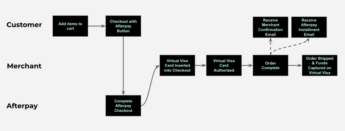 After the customer completes the Afterpay checkout, Afterpay returns a single-use Visa card (US, UK, Canada) or Mastercard (Australia) for you to use in your existing checkout.