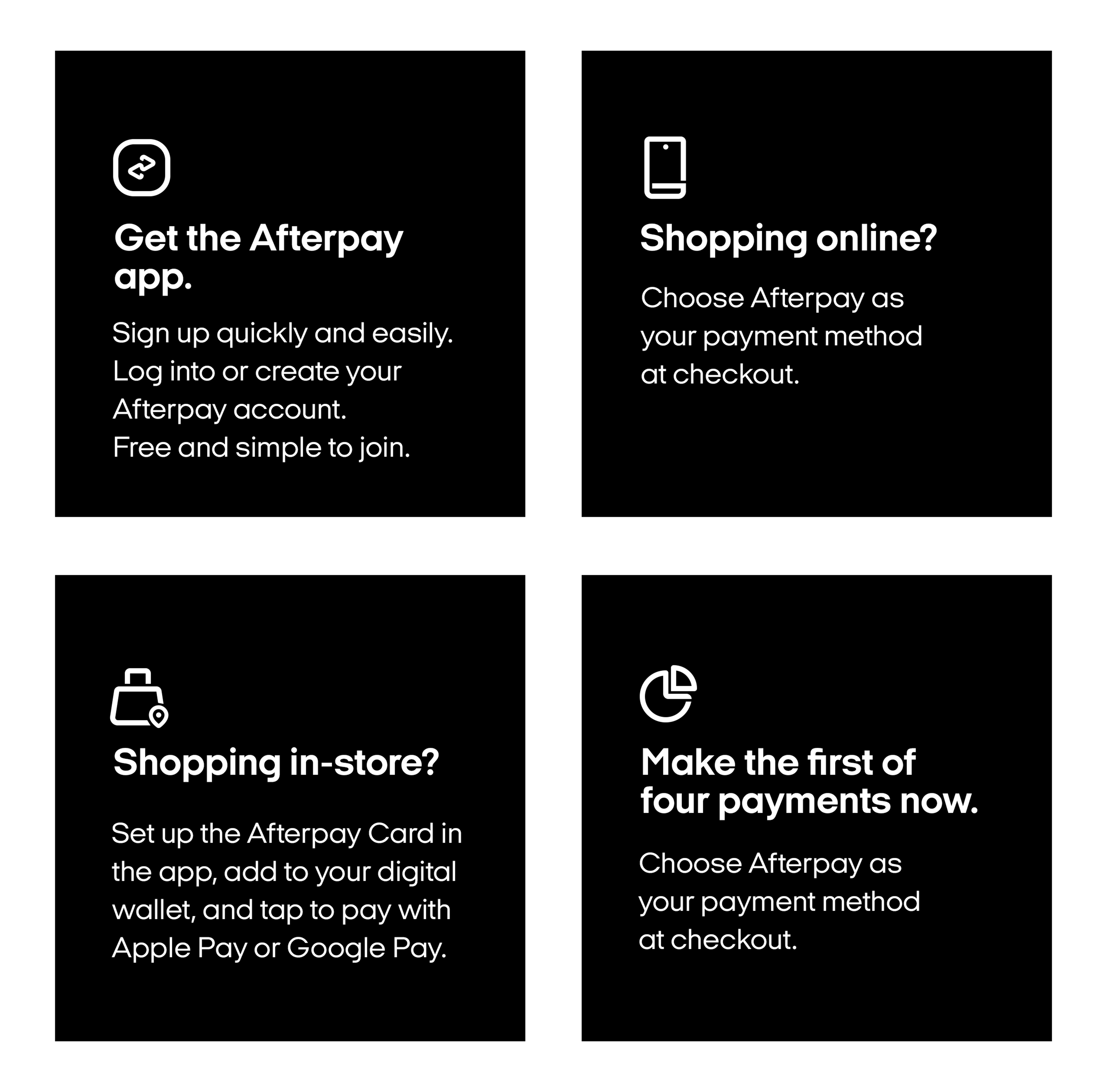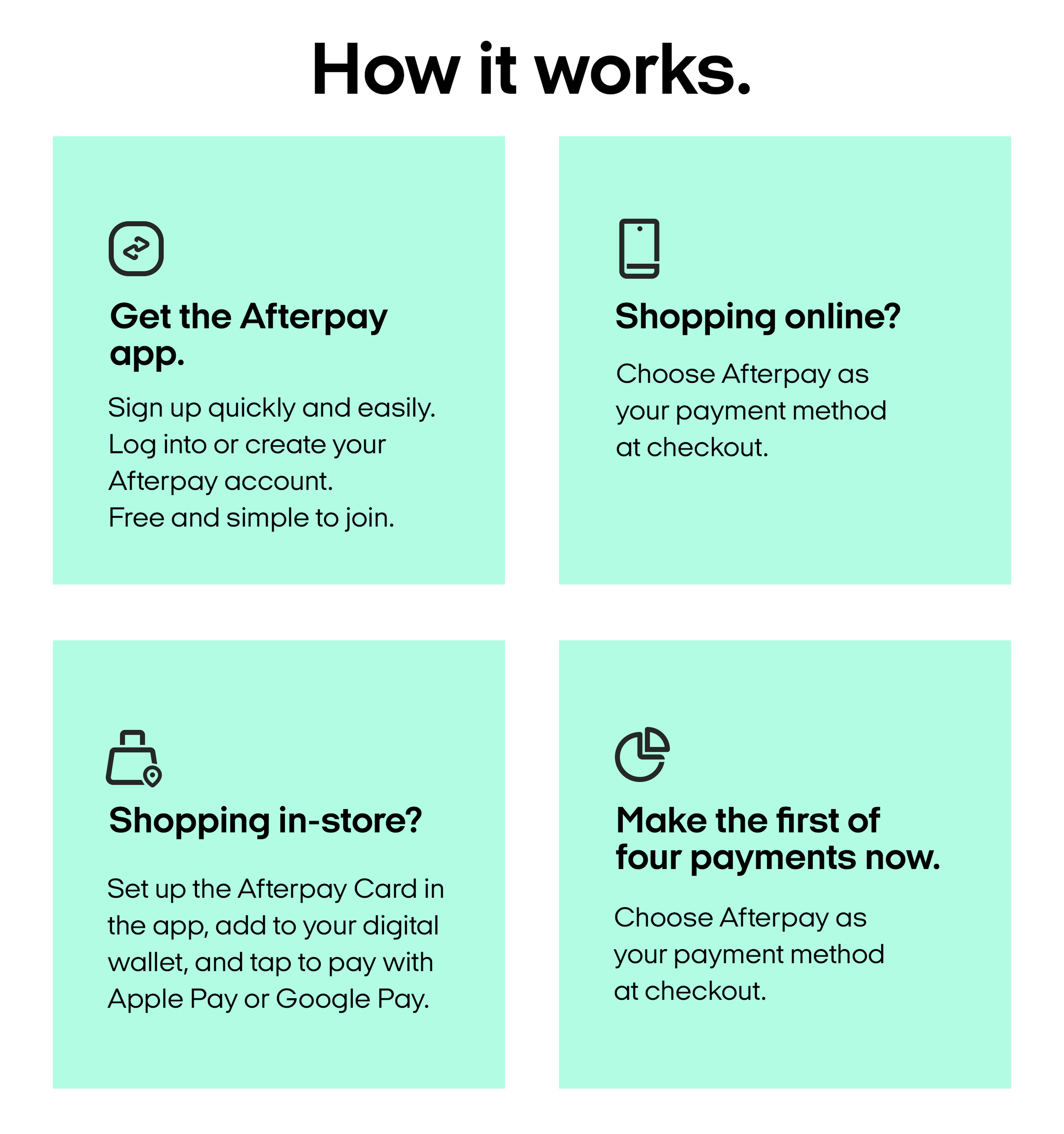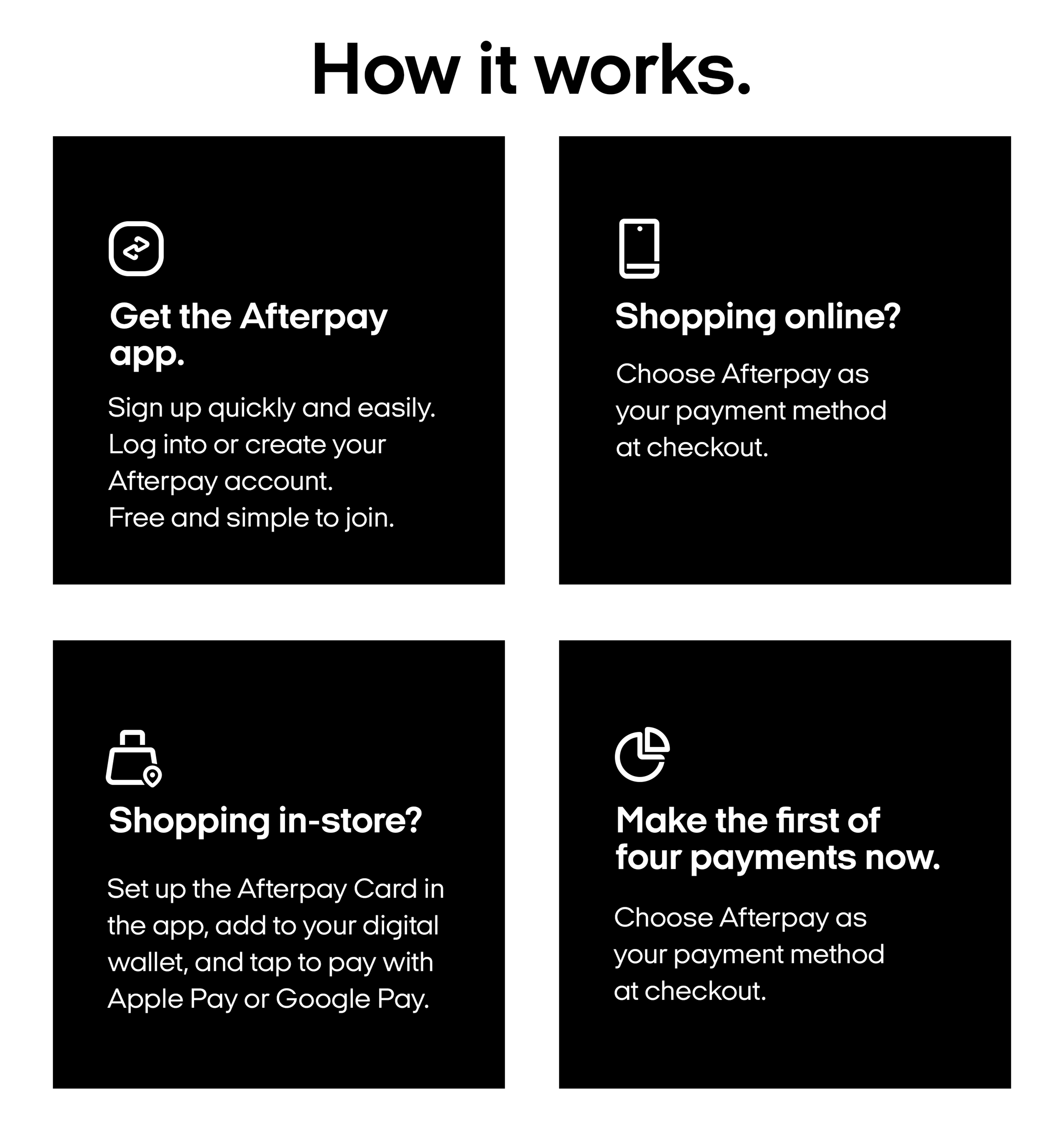 Four text-squares that sumnmarise how Afterpay works. The header versions have a How It Works heading.