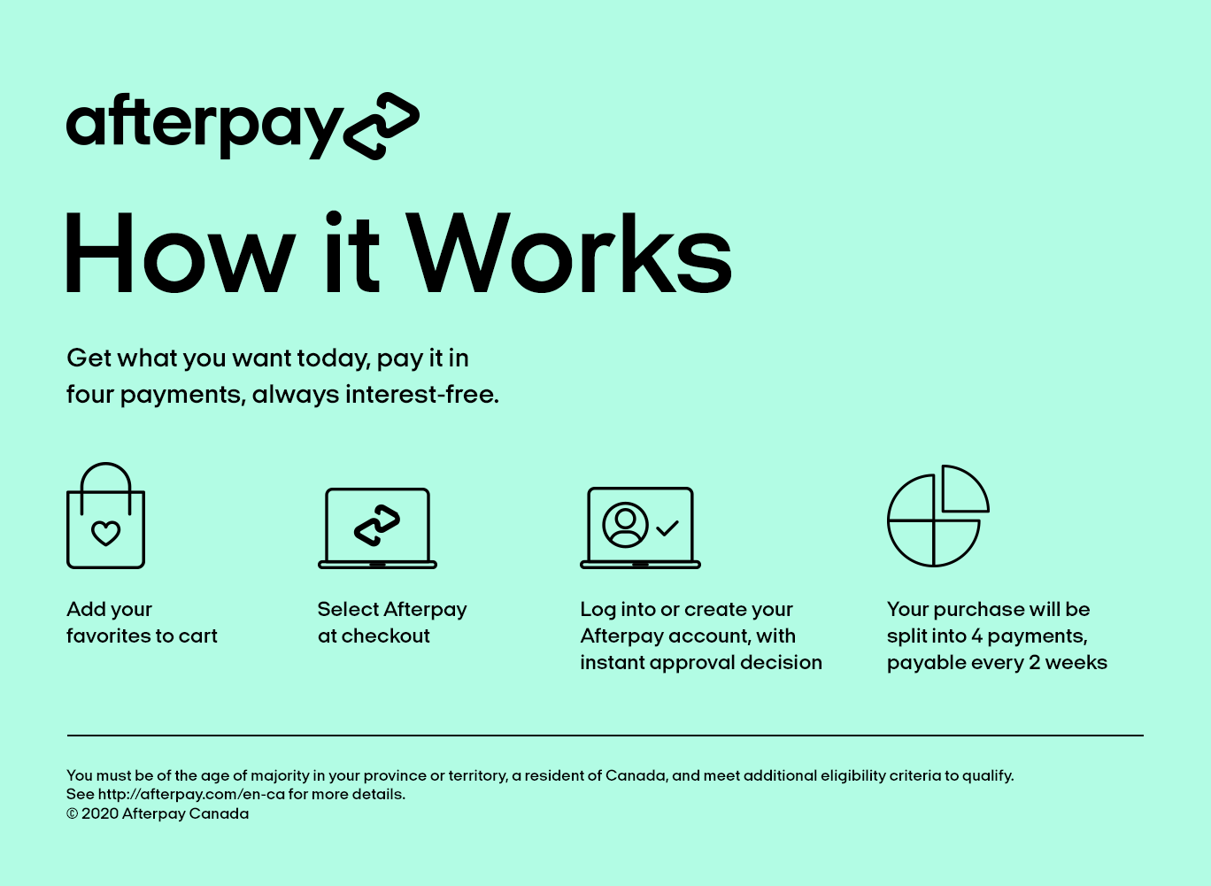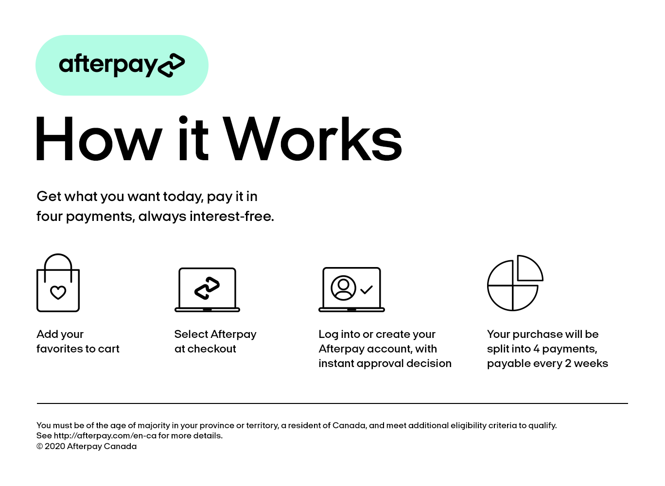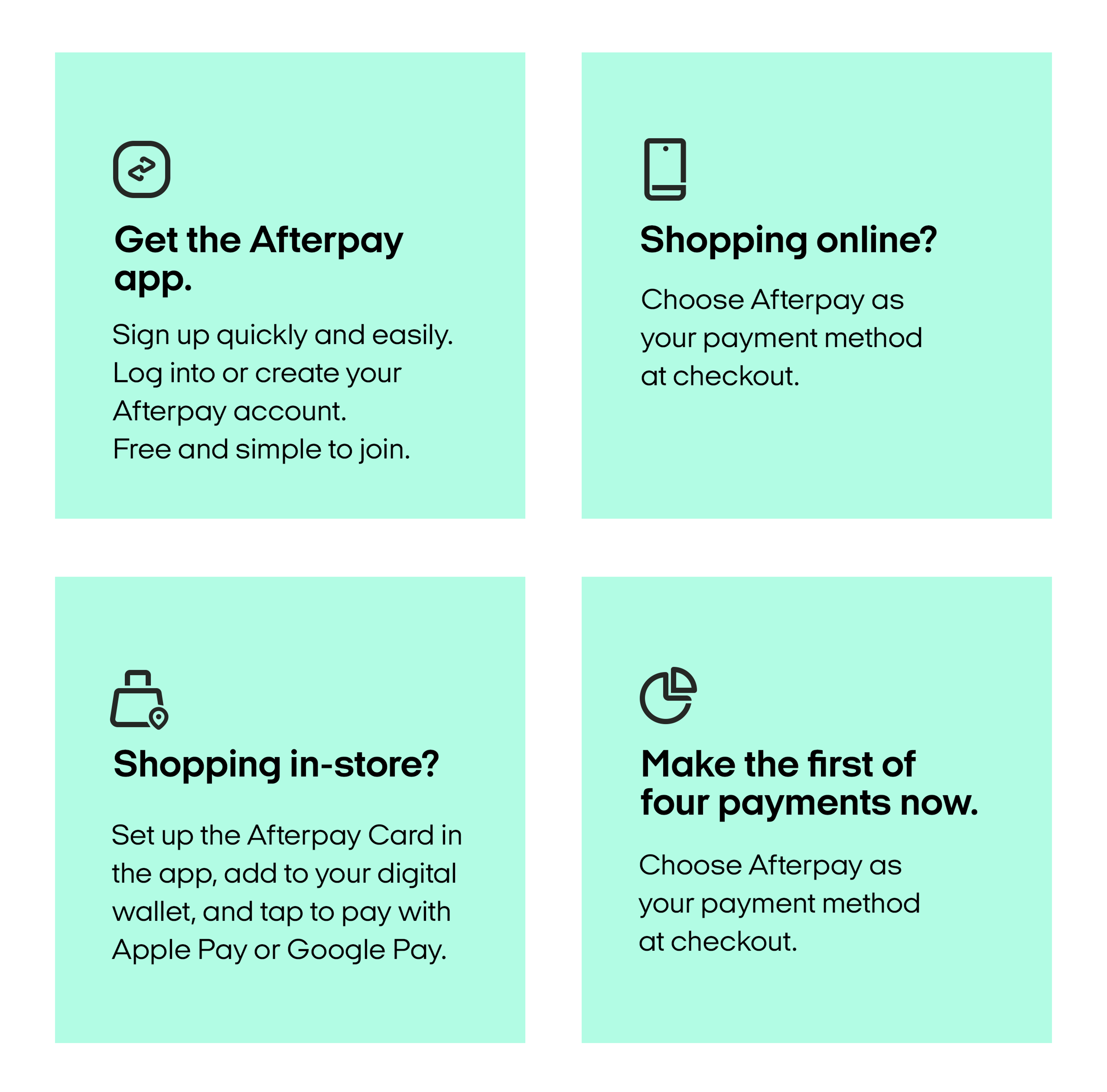 Four text-squares that sumnmarise how Afterpay works. The header versions have a How It Works heading.